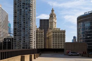 Wrigley's Clocktower as viewed from the parking lot at State and Kinzie. There is a building now that obstructs this original view.